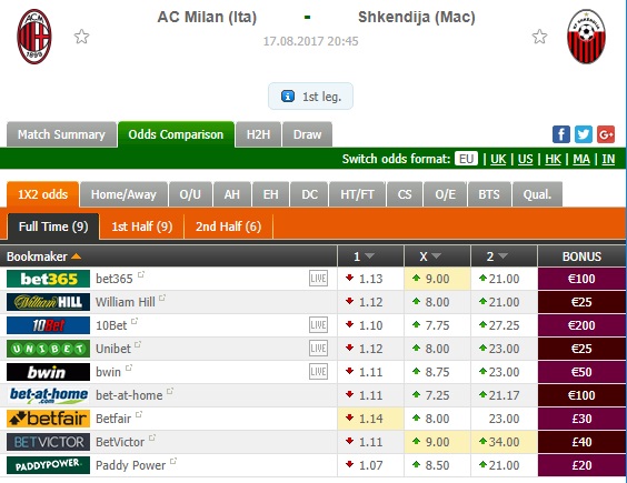 Skuadra shqiptare llogaritet si autsajdere për këtë ndeshje, pasi fitorja e tyre kuotohet me kuotat nga 21.00 deri në 34.00, derisa ajo e Milanit nga 1.07 më e larta 1.14. /Gazeta Express/